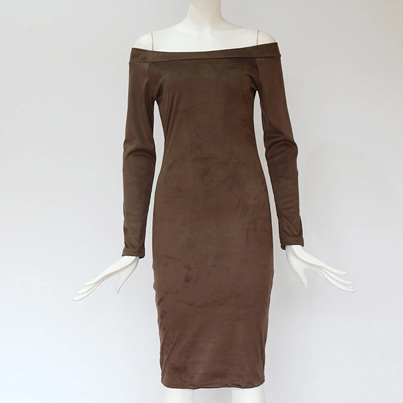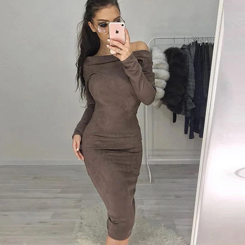 Luxury Office Lady Dress Slim Sheath Bodycon Party Dress Knee Length Autumn Dress Solid Color Slash Neck L
