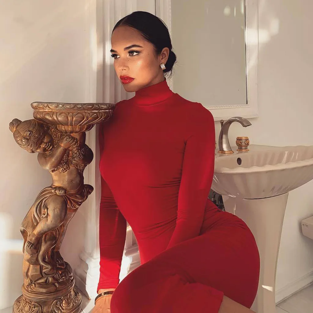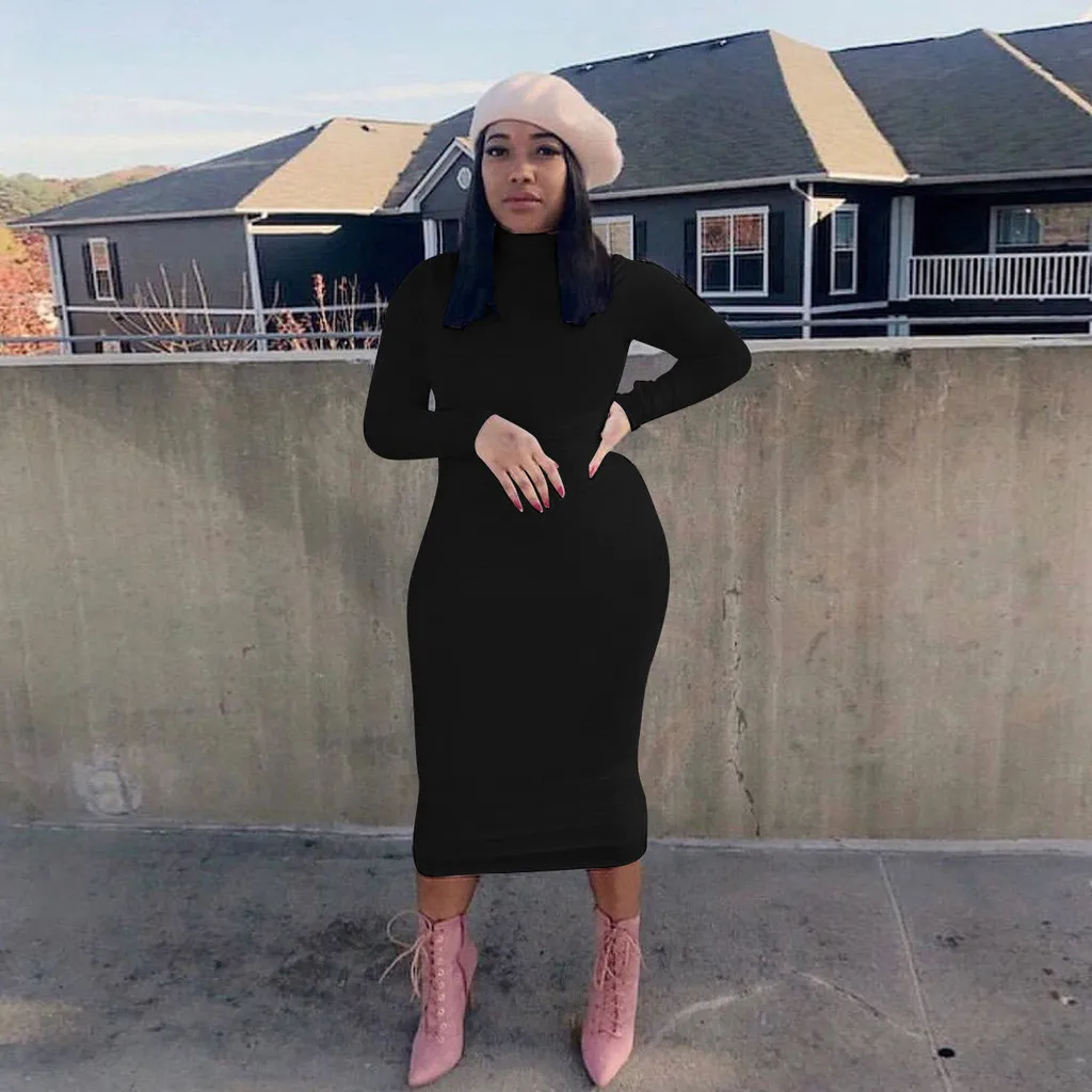 Best place to buy Vestidos Women Autumn Dress Sexy Long Sleeve Solid Turtleneck Basic Slim Tight Long Dress ropa muje