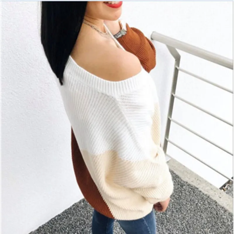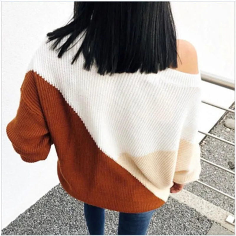 Order Vrouwen Mode Patchwork Gebreide Truien Lady Off Shoulder Losse Lange Mouwen Winter Tops