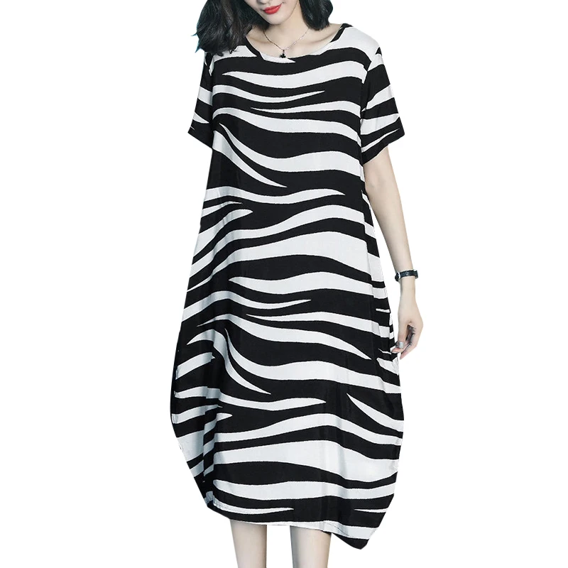 Affordable Women Summer Round Collar Short Sleeve Cartoon Zebra Print Long T-Shirt Loose Mid-Length 4XL Plus S