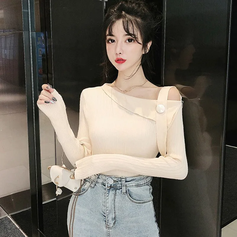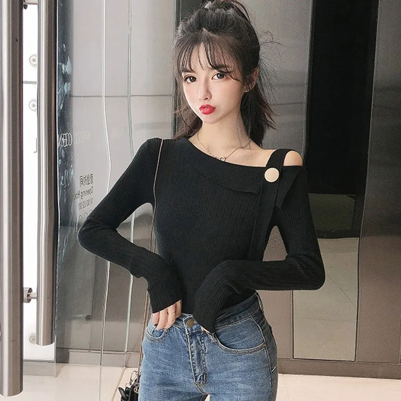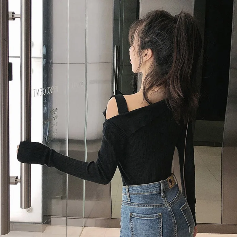 Purchase 2019 Nieuw Uit De Schouder Vrouwen Trui Mode Slanke Effen Kleur Bodem Shirt Herfst Winter Sexy Lang