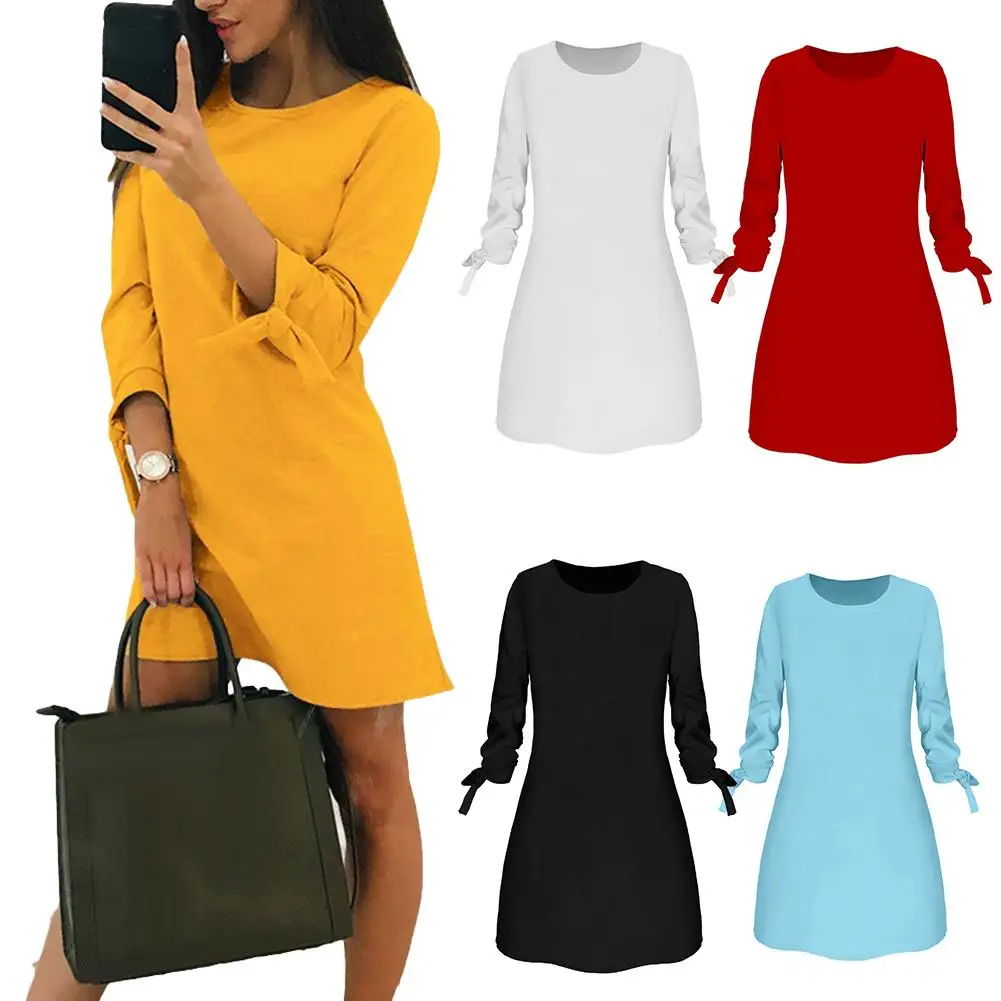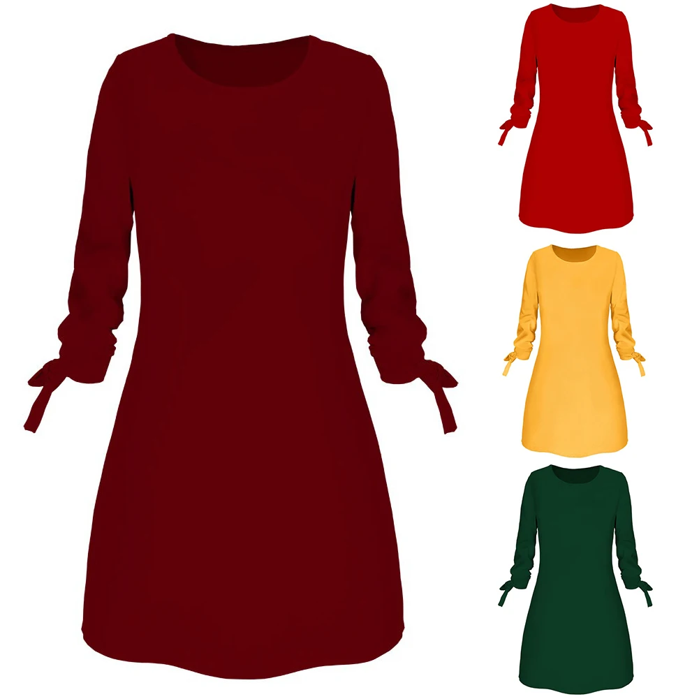 Luxury Autumn Winter O-Neck Solid Bow Elegant Straigth Sexy Dress Women Long Sleeve Round Neck Loose Dress