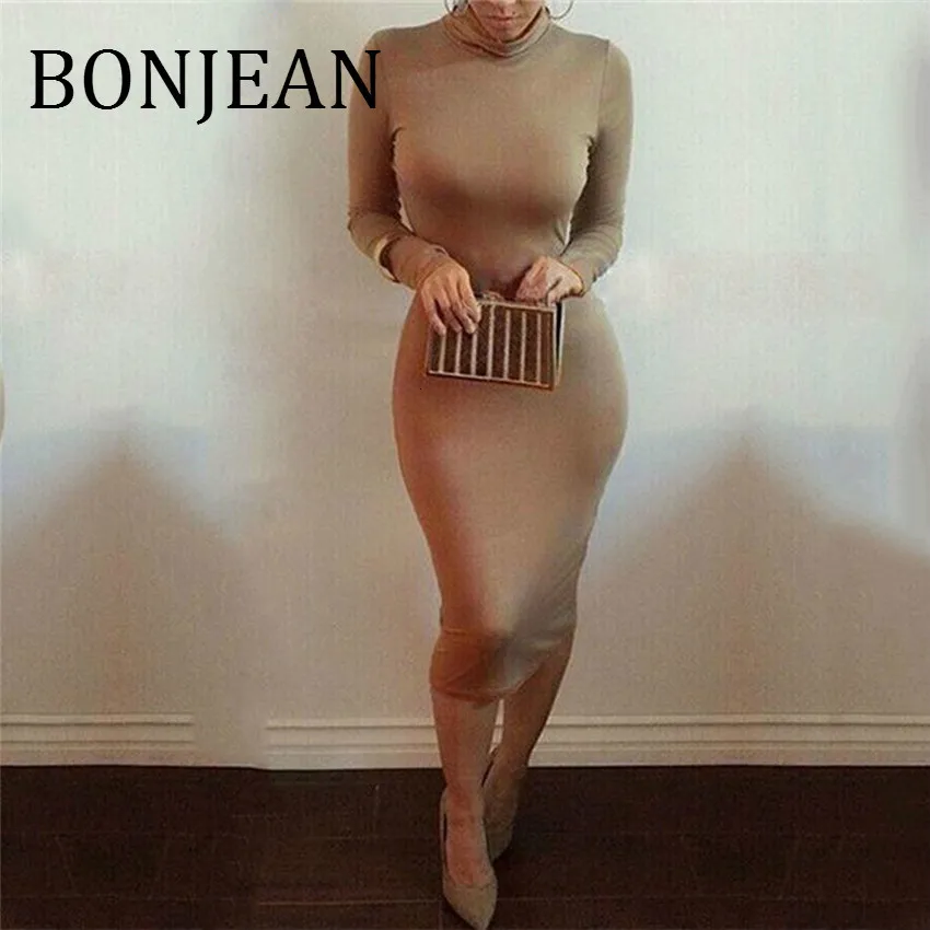 Offer BONJEAN Women Bandage Dress Autumn Turtleneck Slim Long Sleeve Bodycon Dress Fashion High Neck Club