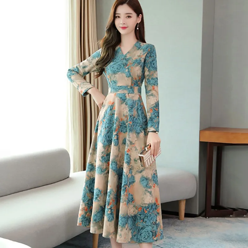Expensive Vintage Dress Women V-neck Long Sleeve Big Swing Elegant Princess Print Slim Waist Boho Floral Vest
