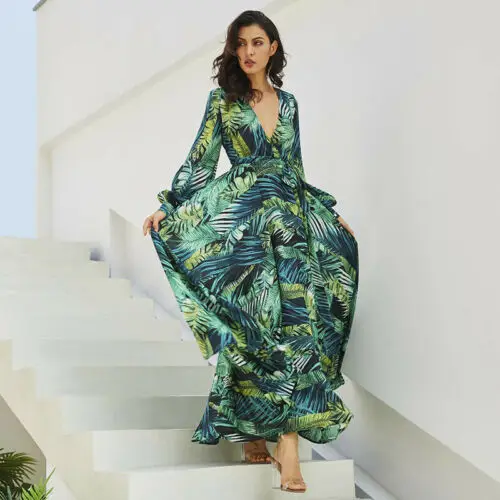 Sale 2019 New Women Long Sleeve V Neck Floral Boho Vintage Maxi Dress Belt Lace Up Tunic DrapCasual Part