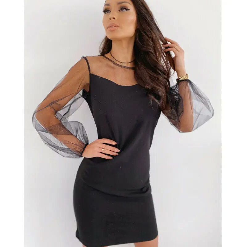 Cheap New Style Ladies Sexy Mesh Sleeve Puff Sleeve Dress Women Long Sleeve Slim Fit Dress Casual Mesh Pa